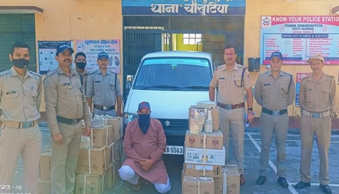 जिले की चौखुटिया थानांतर्गत पुलिस ने कार में तस्करी की जा रही अंग्रेजी शराब की 27 पेटियां पकड़ी। जो रात अवैध रूप से परिवहन की जा रही थी, लेकिन पुलिस चेकिंग मेें पकड़ी गई। बरामद शराब की कीमत दो लाख रुपये बताई गई है। फिलहाल आरोपी चालक को गिरफ्तार करते हुए वाहन सीज कर लिया गया है।
