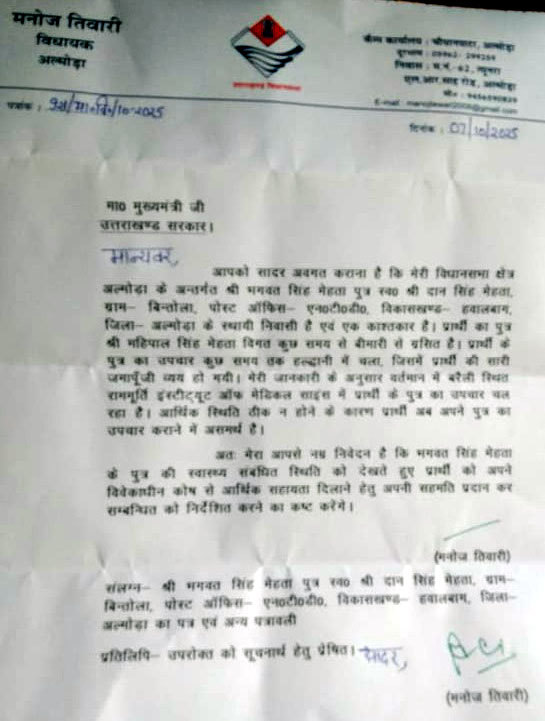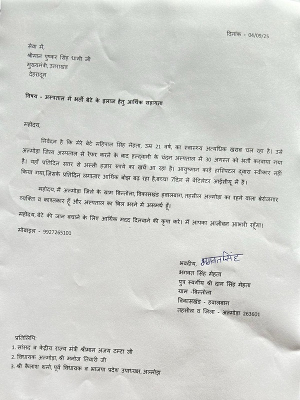 इस दुख की घड़ी में, जब एक गरीब परिवार को सबसे ज्यादा मदद की ज़रूरत थी, तब जनप्रतिनिधियों ने आँखें फेर लीं।परिवार का आरोप है कि मुख्यमंत्री पुष्कर सिंह धामी, पूर्व सीएम भगत सिंह कोश्यारी, राज्य मंत्री सुरेश भट्ट, विधायक मनोज तिवारी, मंत्री अजय टम्टा और भाजपा प्रदेश उपाध्यक्ष कैलाश शर्मा जैसे बड़े नेताओं को पत्र लिखे गए, लेकिन किसी ने भी किसी तरह की कोई मदद नहीं की।