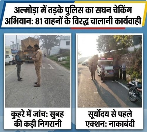 वरिष्ठ पुलिस अधीक्षक चंद्रशेखर घोडके द्वारा जनपद में अपराध नियंत्रण और सुचारू यातायात व्यवस्था के लिए समस्त पुलिस बल को अलर्ट पर रहने के निर्देश दिए गए थे। इसी क्रम में आज, 25 मार्च 2026 की सुबह अपर पुलिस अधीक्षक हरबन्स सिंह के मार्गदर्शन और क्षेत्राधिकारी अल्मोड़ा बलवन्त सिंह व क्षेत्राधिकारी रानीखेत विमल प्रसाद के पर्यवेक्षण में व्यापक चेकिंग अभियान चलाया गया।