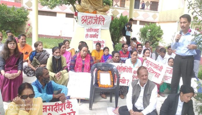 उपपा नेता जगदीश चंद्र की हत्या के विरोध में आज यहां गांधी पार्क में विभिन्न संगठनों ने धरना देते हुए स्व. जगदीश चंद्र को श्रद्धांजलि दी। विभिन्न संगठनों के लोग दोपहर गांधी पार्क में जुटे, जहां उन्होंने इस हत्याकांड के विरोध में नारेबाजी की। इसके बाद धरने पर बैठ गए, जहां श्रद्धांजलि सभा हुई। जिसमें मामले पर जिला व पुलिस प्रशासन पर घोर लापरवाही बरतने का आरोप लगाया और मुख्यमंत्री की चुप्पी पर आश्चर्य प्रकट किया।