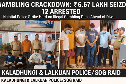 सीएनई रिपोर्ट, नैनीताल। दीपावली पर्व के मद्देनजर वरिष्ठ पुलिस अधीक्षक प्रहलाद नारायण मीणा (IPS) के सख्त निर्देशों का असर जनपद में देखने को मिला। पुलिस ने जुए के अड्डों पर बड़ी कार्रवाई करते हुए दो अलग-अलग अभियानों में कुल 12 जुआरियों को गिरफ्तार किया है। इस दौरान पुलिस ने ₹6,67,650 की नकद राशि, ताश के पत्ते, और अन्य जुआ सामग्री बरामद की है।