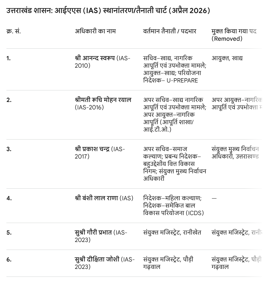 - क्षेत्रीय फेरबदल: इसके अलावा हर गिरी (हरिद्वार), अनुराग आर्य (नैनीताल), रविंद्र कुमार जुवांठा (देहरादून), सुधीर कुमार (नैनीताल), प्रेमलाल (उत्तरकाशी), और यशवीर सिंह (चमोली) सहित कई अधिकारियों को नए जिलों में डिप्टी कलेक्टर के रूप में तैनात किया गया है।