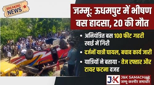 उधमपुर, जम्मू-कश्मीर | सोमवार सुबह जम्मू के उधमपुर जिले से एक हृदयविदारक खबर सामने आई है। रामनगर क्षेत्र के कागोट गांव के पास एक यात्री बस अनियंत्रित होकर करीब 100 फीट गहरी खाई में जा गिरी। इस भीषण हादसे में अब तक 20 लोगों की मौत की पुष्टि हो चुकी है, जबकि दर्जनों अन्य गंभीर रूप से घायल हैं।