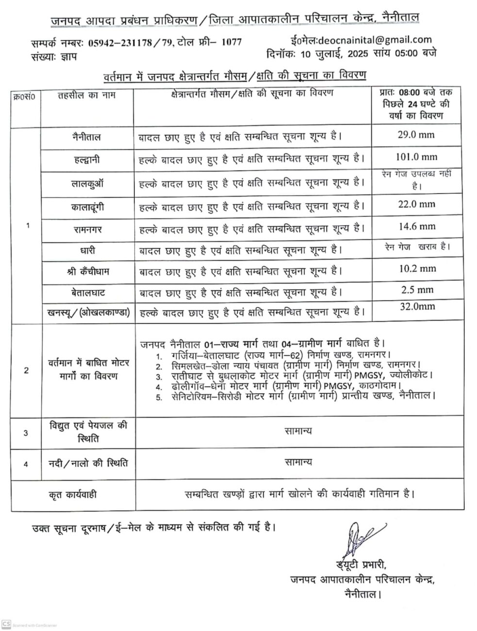 जनपद आपतकालीन परिचालन केंद्र से जारी सूचना के अनुसार नैनीताल जनपद अंतर्गत हल्द्वानी में विगत 24 घंटों में 101 एमएम वर्षा दर्ज की गई है। वहीं, बेतालघाट में सबसे कम मात्र 2.5 एमएम बारिश हुई। अन्य तहसीलों की यदि बात करें तो नैनीताल में 29, कालाढूंगी 22, रामनगर 14.6, कैंचीधाम 10.2, ओखलकांडा 32 एमएम बारिश विगत 24 घंटों में दर्ज हुई है।