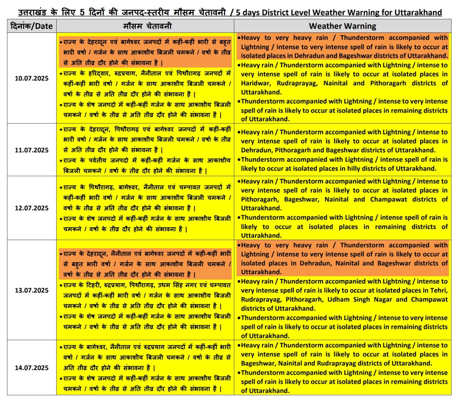मौसम विभाग द्वारा जारी रिपोर्ट के अनुसार 11 जुलाई को देहरादून, पिथौरागढ़ व बागेश्वर, 12 जुलाई को पिथौरागढ़, बागेश्वर, नैनीताल व चंपावत कहीं—कहीं भारी वर्षा हो सकती है। इन दो दिनों का यलो अलर्ट जारी हुआ है। वहीं, 13 जुलाई का आरेंज अलर्ट बारिश को लेकर जारी हुआ। जिसमें बताया गया है कि देहरादून, नैनीताल व बागेश्वर जनपद में कहीं भारी से बहुत भारी बारिश की संभावन है।