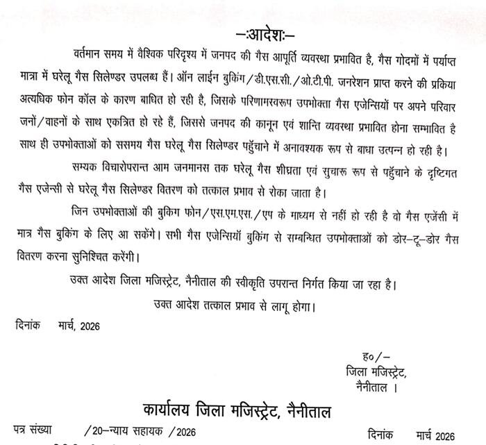 जिला मजिस्ट्रेट नैनीताल ने जारी आदेश में कहा गया है कि ऑनलाईन बुकिंग, डीएसपी, ओटीपी आदि प्रक्रियाओं में अत्यधिक फोन कॉल आने के कारण बाधा उत्पन्न हो रही है, जिससे उपभोक्ताओं को गैस एजेंसियों में अनावश्यक भीड़ लगानी पड़ रही है। इससे कानून एवं शांति व्यवस्था प्रभावित होने की आशंका भी बनी हुई है तथा समय पर घरेलू गैस सिलेंडर उपभोक्ताओं तक पहुंचाने में बाधा उत्पन्न हो रही है।