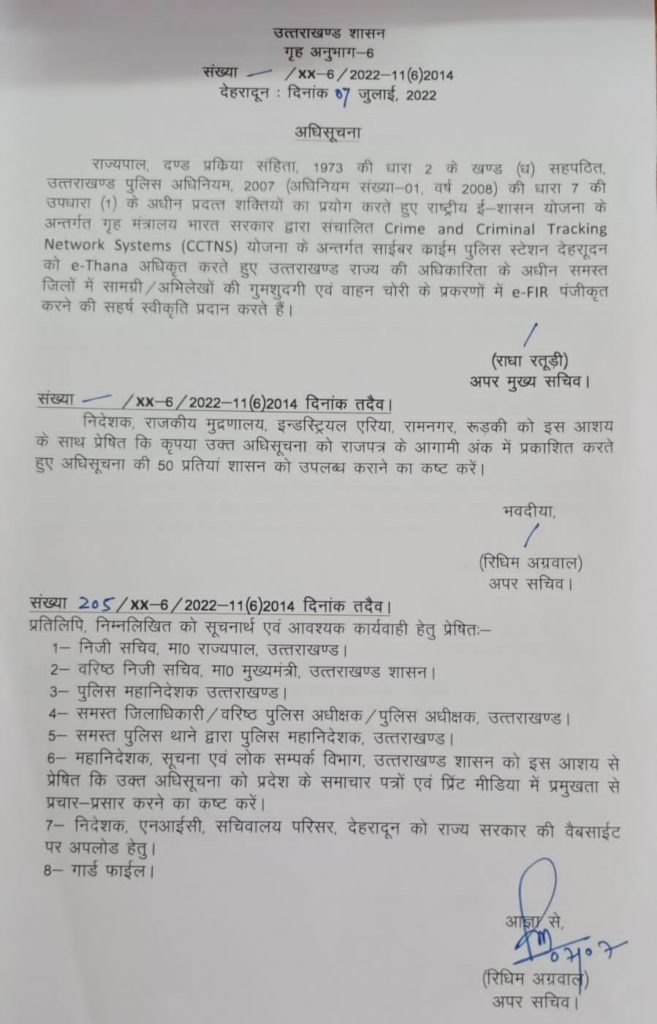 जारी आदेश में कहा गया है, राज्यपाल, दण्ड प्रक्रिया सहिता, 1973 की धारा 2 के खण्ड (घ) सहपठित, उत्तराखण्ड पुलिस अधिनियम 2007 (अधिनियम संख्या-01 वर्ष 2008) की धारा 7 की उपधारा (1) के अधीन प्रदत्त शक्तियों का प्रयोग करते हुए राष्ट्रीय ई-शासन योजना के अन्तर्गत गृह मंत्रालय भारत सरकार द्वारा संचालित Crime and Criminal Tracking Network Systems (CCTNS) योजना के अन्तर्गत साईबर काईम पुलिस स्टेशन देहरादून को e-Thana अधिकृत करते हुए उत्तराखण्ड राज्य की अधिकारिता के अधीन समस्त जिलों में सामग्री / अभिलेखों की गुमशुदगी एवं वाहन चोरी के प्रकरणों में e-FIR पंजीकृत करने की सहर्ष स्वीकृति प्रदान करते हैं।