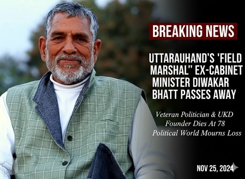 सीएनई रिपोर्टर, देहरादून/हरिद्वार: उत्तराखंड की राजनीति के एक बड़े हस्ताक्षर, पूर्व कैबिनेट मंत्री और जननेता दिवाकर भट्ट अब हमारे बीच नहीं रहे। राज्य आंदोलन के सबसे आक्रामक और समर्पित नेताओं में शामिल उत्तराखंड क्रांति दल (UKD) के पूर्व केंद्रीय अध्यक्ष ‘फील्ड मार्शल’ दिवाकर भट्ट ने आज (25 नवंबर, मंगलवार) लंबी बीमारी के बाद हरिद्वार स्थित अपने आवास पर शाम 4:30 बजे अंतिम सांस ली। उनके निधन की खबर से उत्तराखंड के राजनीतिक और सामाजिक क्षेत्रों में शोक की लहर दौड़ गई है।