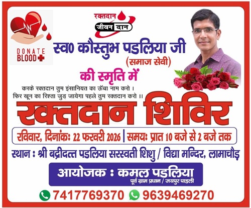 शिविर के आयोजक कमल पडालिया (पूर्व ग्राम प्रधान, जयपुर पडली) ने बताया कि रक्तदान सबसे बड़ा मानव सेवा कार्य है। एक यूनिट रक्त किसी की जान बचा सकता है। उन्होंने क्षेत्र के सभी नागरिकों, युवाओं, सामाजिक संगठनों एवं स्वयंसेवी संस्थाओं से अधिक से अधिक संख्या में पहुंचकर रक्तदान करने की अपील की है।