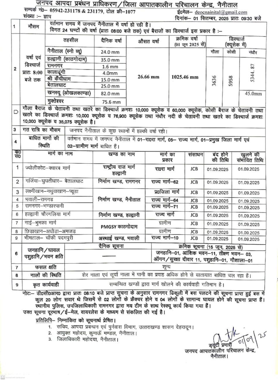 जिला आपदा प्रबंधन प्राधिकरण द्वारा जारी रिपोर्ट के अनुसार, नैनीताल जनपद में भी सोमवार 1 सितंबर, 2025 को कुल 9 मार्गों पर यातायात अवरुद्ध हो गया है। इनमें राष्ट्रीय राजमार्ग, राज्य मार्ग और ग्रामीण मार्ग शामिल हैं। छड़ा और नावली के बीच लगातार पत्थर गिरने से सड़क बंद है, जिसे खोलने के लिए जेसीबी मशीनें लगाई गई हैं।