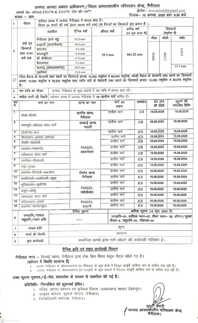 नैनीताल, 15 अगस्त, 2025: नैनीताल जनपद आपदा प्रबंधन प्राधिकरण/जिला आपातकालीन परिचालन केंद्र द्वारा जारी नवीनतम बुलेटिन के अनुसार, जिले में भारी बारिश और बाढ़ का अलर्ट जारी किया गया है। पिछले 24 घंटों में हुई बारिश के आंकड़े चौंकाने वाले हैं और नदी-नालों में जलस्तर तेजी से बढ़ रहा है।