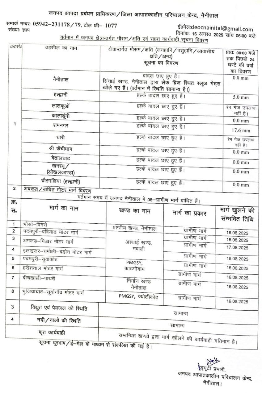 नैनीताल: शनिवार को नैनीताल जनपद में मौसम सामान्य रहा और किसी भी स्थान पर अधिक बारिश दर्ज नहीं की गई। आपदा प्रबंधन परिचालन केंद्र, नैनीताल द्वारा शनिवार शाम 6 बजे जारी की गई एक रिपोर्ट के अनुसार, भले ही जिले में बारिश नहीं हुई हो, लेकिन भूस्खलन या अन्य कारणों से कुल 08 ग्रामीण मोटर मार्ग बंद हैं, जिससे आवागमन प्रभावित हुआ है।
