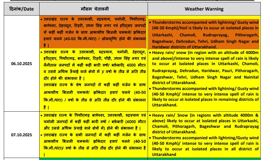 7 अक्टूबर (मंगलवार) को पिथौरागढ़, उत्तरकाशी, बागेश्वर, रुद्रप्रयाग और चमोली जिलों में निचले इलाकों में भारी बारिश और उच्च हिमालयी क्षेत्रों में बर्फबारी की संभावना जताई गई है। इस दौरान 30 से 40 किमी प्रति घंटे की रफ्तार से हवाएं चल सकती हैं।