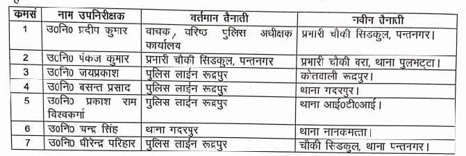 रुद्रपुर | एसएसपी डॉ. मंजूनाथ टीसी ने आज जिले में सात उप निरीक्षकों के तबादले कर दिए हैं।