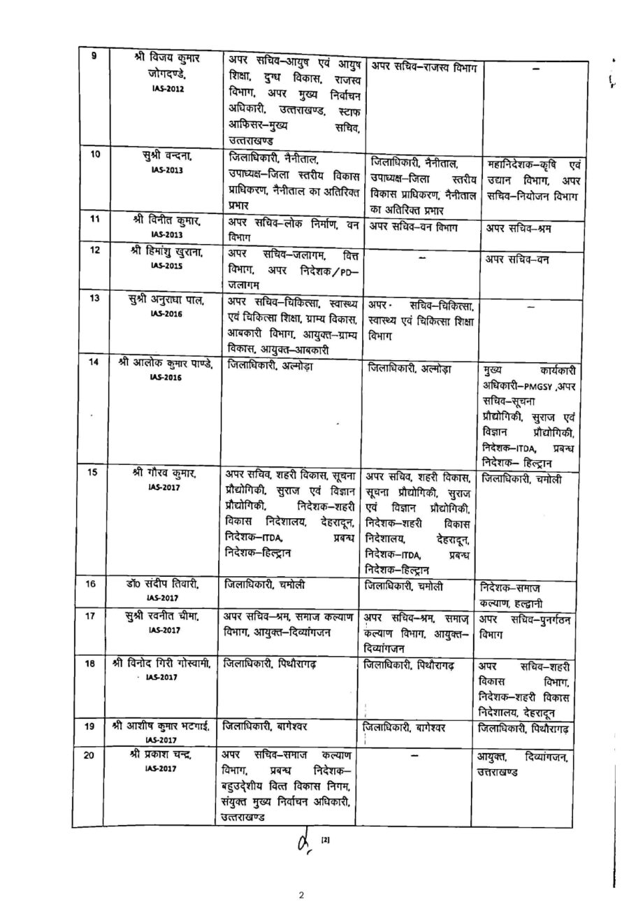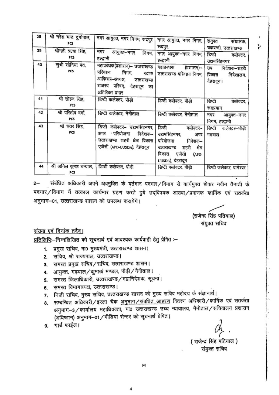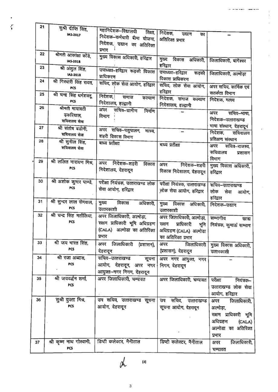 सीएनई रिपोर्टर, देहरादून: प्रदेश शासन ने आज 44 आईएएस व पीसीएस अधिकारियों के तबादले कर दिए हैं। तबादला सूची में 23 आईएएस और 21 पीसीएस अधिकारी शामिल हैं। इसमें अल्मोड़ा व नैनीताल के जिलाधिकारी भी बदल दिए गए हैं। अब अंशुल सिंह अल्मोड़ा और ललित मोहन रयाल नैनीताल के नये जिलाधिकारी होंगे। कई आईएएस और पीसीएस अधिकारियों के विभाग बदल दिए गए हैं।